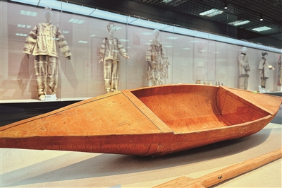 其中,桦皮船颇具代表性。在展厅,有一艘长约6米的桦皮船,两端尖细微翘,呈柳叶形,线条流畅,造型优美。它采用纯天然的桦树皮经手工制作而成,由船、船桨、小鱼篓三部分组成,以樟松木为骨架,外包桦皮,缝隙处涂抹松油,既坚固又防水。桦皮船小巧轻盈,无论是在江河湖海中捕鱼,还是在森林草原上狩猎,它都是北方渔猎民族不可或缺的交通工具。