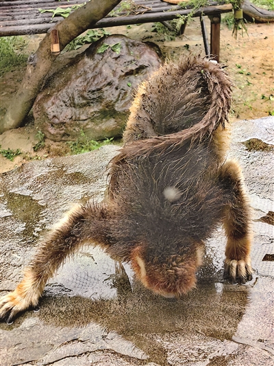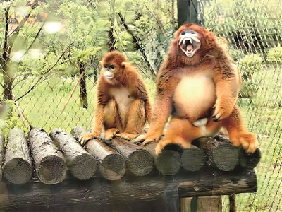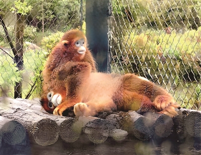 5月12日早晨,绵绵细雨消停之时,我们走进了浙江宁波野生动物园里的“国宝秘境”。刚踏上两侧布有金属丝网的空中通道,就听闻前方人群里传来一阵呼喊。循声望去,只见左前方木垛子上躺着一只肥硕的猴子,其身后小猴像是在给它挠痒痒。
