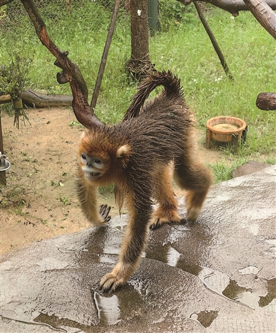 | 5月12日早晨,宁波野生动物园里,几只川金丝猴的自发“表演”。 尹传红 摄 |