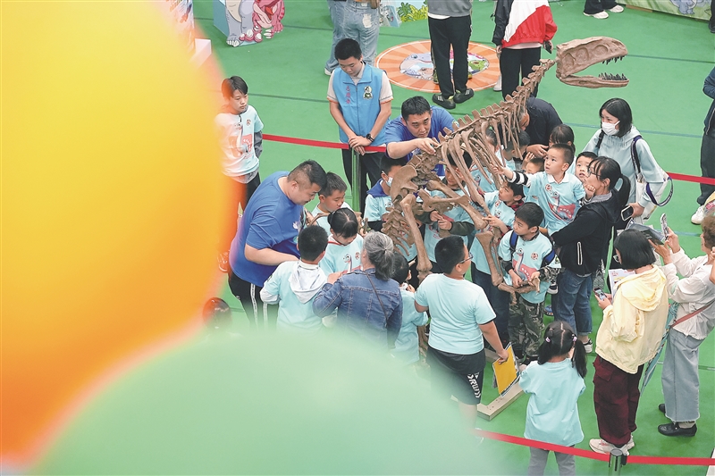在中国古动物馆活动现场,每项体验活动都围满了小朋友。制作小盗龙化石模型、了解“恐龙五宝”的故事、观看《重返二叠纪》《会飞的恐龙》等3D影片……这些活动都围绕恐龙展开,孩子们可在玩乐中学习古生物科学知识。