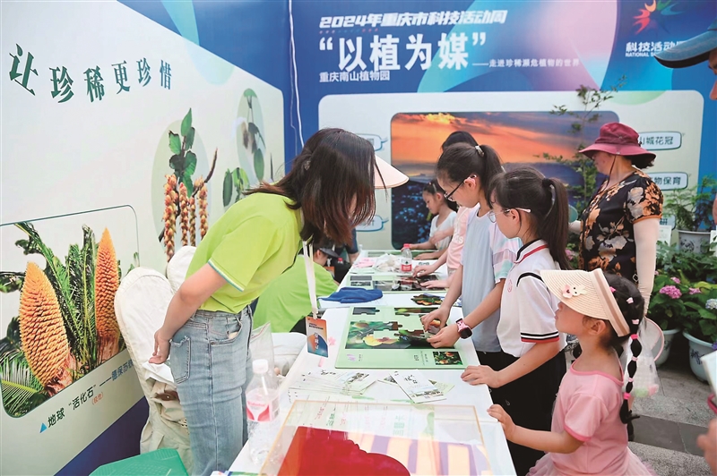 | ③重庆市科技活动周现场,重庆南山植物园工作人员向小朋友们科普珍稀濒危植物知识。(重庆市科技局供图) |