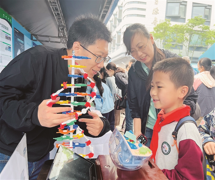 | ④青岛科技活动周上,青岛华大基因研究院工作人员为小朋友讲解基因知识。 科普时报记者 宋迎迎 摄 |