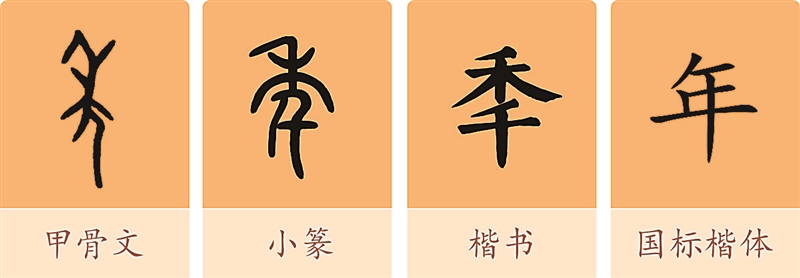 继续说“年”这个字。“年”的甲骨文上面是“禾”,下面是“人”,表示禾谷成熟,农夫将成熟的庄稼背回家。篆文中,下面的人写成了“千”,形成了“年”的异体字——“秊”。后来,又逐步演变成了现在的“年”字。