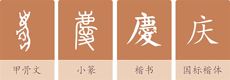 先拿“庆”字来说吧。“庆”的甲骨文由“鹿”和“心”组成。在古代,鹿皮是珍贵的礼品,古人常送鹿皮表达心意,向他人恭喜道贺。后来,经过复杂的形变,“鹿”和“心”融合为一体,演变成繁体楷书的“慶”字。汉字简化时,把里面复杂的笔画简写成“大”,就演变成了“庆”字。于是,现在的“庆”字已经看不出来“鹿”的痕迹了。