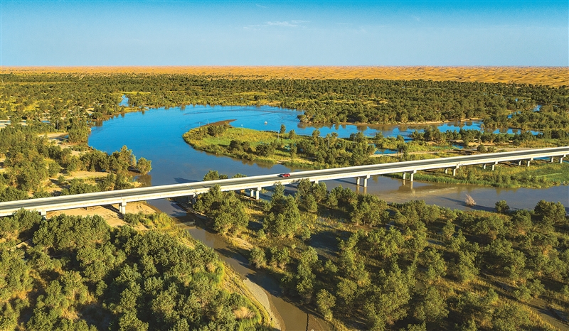 | 新疆巴州塔里木河中下游尉犁段,塔里木河奔流而下,河水在沙漠与绿洲间蜿蜒流淌,两岸的胡杨林生机勃勃。视觉中国供图 |