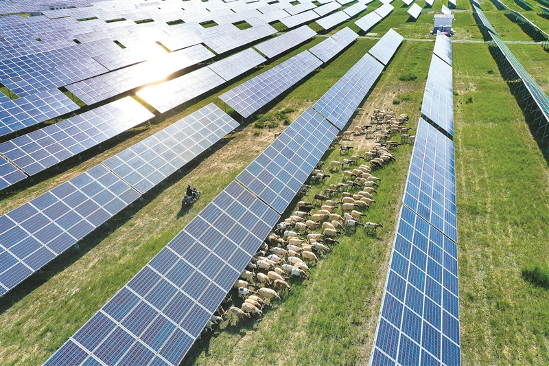 | 青海省海南藏族自治州共和县塔拉滩光伏基地,牧民骑着摩托车在光伏板下放羊。季春红 摄 |