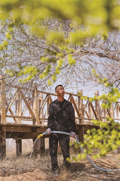| 甘肃省武威市古浪县八步沙林场眼窝子沙治沙点,林场管护员在浇灌植被。新华社记者 费茂华 摄 |