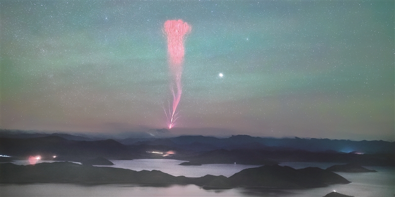 “红色精灵”是一种伴随着雷暴天气所产生的高空大气强烈放电现象,有环状、喷射直流状、水母状,是雷击产生电磁波的结果。这种闪电通常发生在雷暴云云层顶离地面30—90公里的高空,宽度在5—10公里,可持续10—100毫秒。图为6月10日,西藏自治区山南市羊卓雍错湖鲁日拉观景台,“红色精灵”闪电的巨大喷流在库拉岗日雪山之上绽放。视觉中国供图