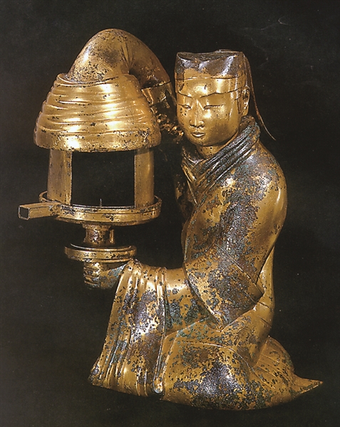 灯的形制随时代发展不断演进。在河北保定满城区西汉中山靖王刘胜墓中,出土一精致的长信宫灯。该灯造型别致,一个跪坐的宫女全神贯注地双手执着一盏灯,诚挚地为主人照明。灯高48厘米,通体用铜制作,外面鎏金。据考证,长信宫灯大约制作于公元前173年至公元前159年之间,2000多年后仍金光夺目。