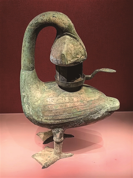 | 汉代海昏侯墓出土的青铜雁鱼釭灯。此灯呈雁回首衔鱼伫立状,由雁衔鱼管、雁体、灯盘、灯罩组合而成。鱼身及雁颈、雁体中空相通。灯火点燃时,烟雾通过鱼和雁颈导入内,被其中贮存的清水吸收溶解,几乎没有污染。两片弧形灯罩可左右转动,既能挡风,又可调节灯光亮度。 尹传红 摄 |