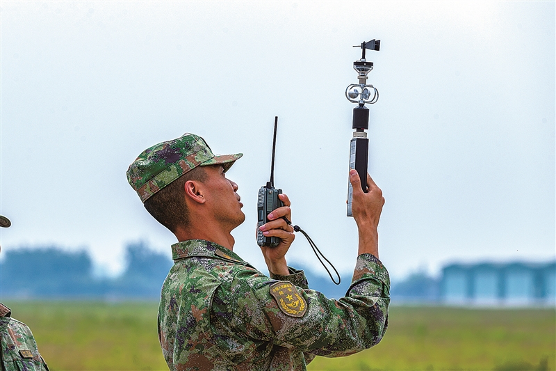 | 参训人员使用手持风速风向仪测量无人机发射场地的气象数据。 胡浪 摄 |