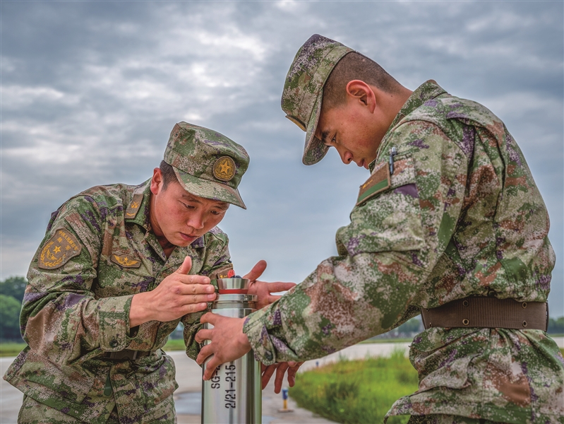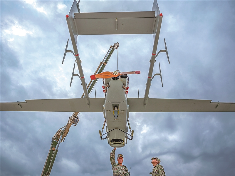 | 图① 官兵们在进行无人机吊装作业。 胡浪 摄 |