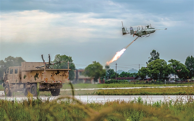 | 某型无人机发射升空,按照规划航线前往预定地域执行侦察和干扰任务。胡浪 摄 |