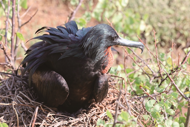 如今正值南美军舰鸟育雏季节。南美军舰鸟(又称南美舰鸟)是一种生活在南美洲的鸟类,它是鹈形目鸟类中的一种,属于鸳鸯科。它们的身体颜色以灰黑色为主,头部和颈部点缀着具有金属光泽的绿色羽毛,尾巴较长。它们主要栖息在南美洲沿海的海岛、海滩和岩石海岸上,以鱼类为主要食物,擅长潜水捕食,能在水中迅速游动并捕捉到鱼类。