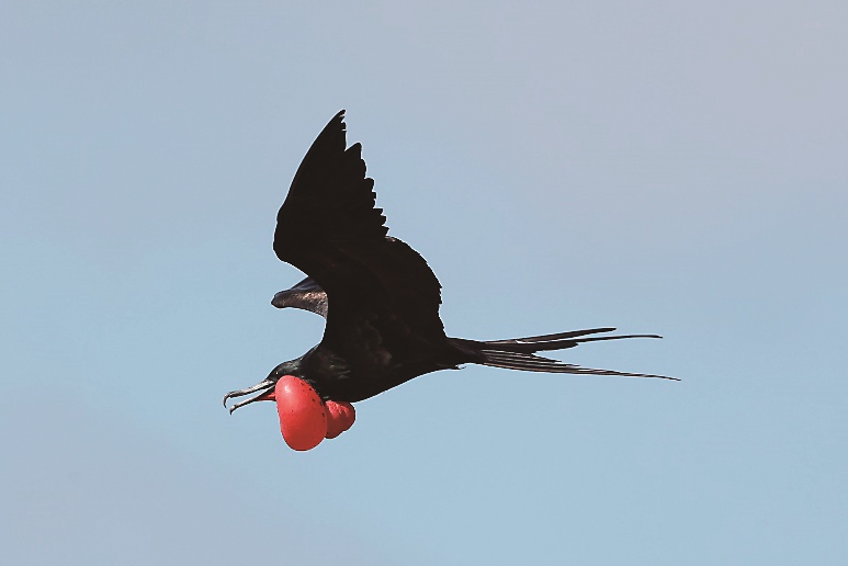 | 上图为孵化中的南美军舰鸟雌鸟。 下图为飞行中的南美军舰鸟雄鸟。 陈晓东 摄 |