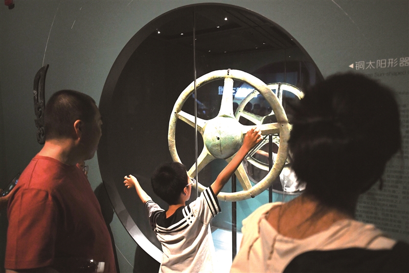 沿展厅继续向前,众多珍贵展品中,一个圆盘状的古怪文物——青铜太阳形器前围满了观众。