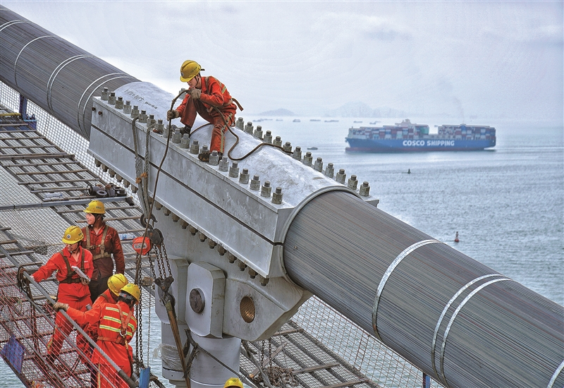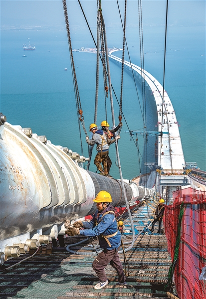 | ① 2023年2月20日,深中通道的工人们正在主缆上进行吊索安装作业。徐瑶 摄 |