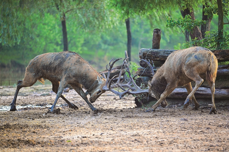 每年6月至8月,麋鹿种群都会迎来一场惊心动魄的鹿王“争霸赛”。在鹿群之中,争斗是最重要的自然法则。激烈的鹿王争霸、不断更换的鹿王,使得每只强健的雄鹿都有机会繁衍后代,保证了种群的遗传多样性,帮助曾经几近灭绝的麋鹿种群“起死回生”。图为7月12日,在江苏省盐城市大丰麋鹿国家级自然保护区,两只雄性麋鹿为“王位”进行激烈打斗。孙华金 摄