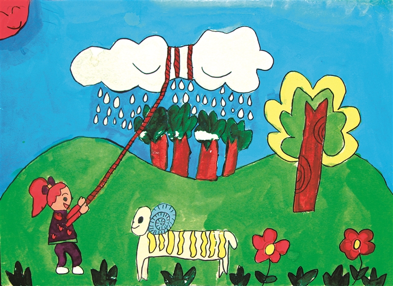 点评:小画家运用丰富的想象力,形象地将天上的积雨云“牵”至干旱的草原,以解决草原缺水和沙化问题。画面形象有趣,这不仅仅是一种科学幻想,更是孩子对未来科技的期待。