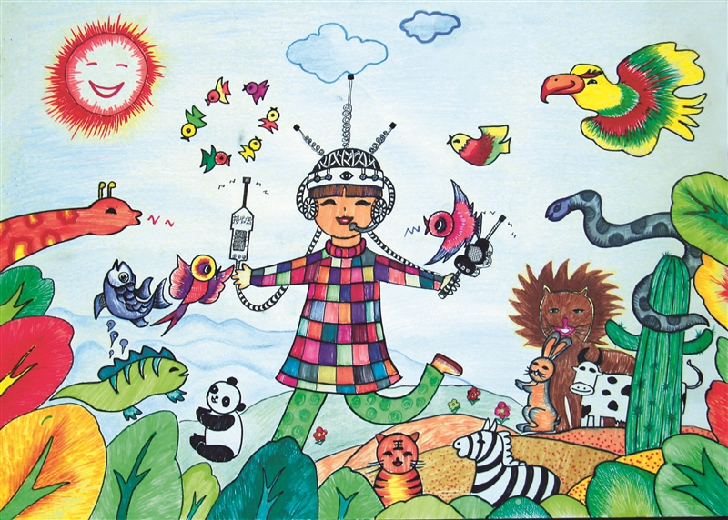 点评: 用翻译神器打破语言沟通的障碍,使人类与各种动物进行交流,是作者最有新意的创作思路。有了这样的翻译神器,牧民能更深入地了解与保护他们的牛羊及各种动物。作品主题鲜明,画面和谐生动。