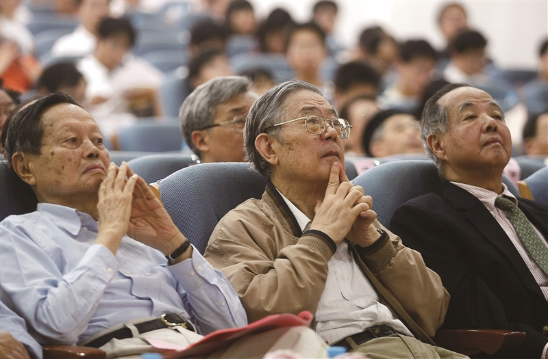 | 图为2008年6月,中国科学院理论物理研究所建院30周年庆典上,杨振宁、周光召、李政道(从左至右)参会。 视觉中国供图 |