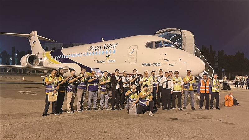 | 5月31日,中国飞机租赁集团向印度尼西亚翎亚航空交付的第三架国产喷气式ARJ21飞机抵达印尼首都雅加达,图为工作人员在国产喷气式ARJ21飞机前合影。 (本文图片源自新华社) |