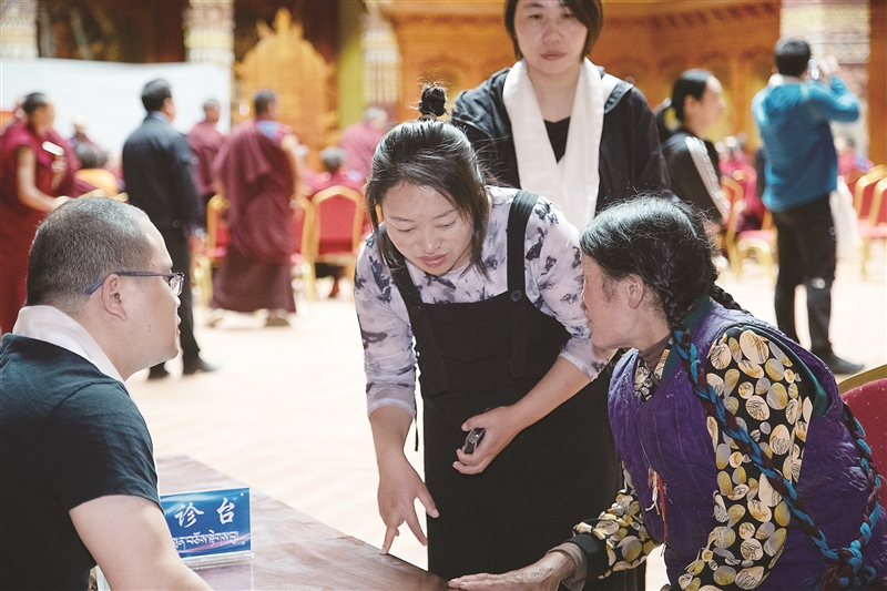 | 左图为启动式现场,广东科学中心的科普老师与当地学生们表演互动节目“大气的压力”,右图为“科普援藏”医疗专家团队在丁青县丁青寺为当地农牧民义诊。杨宇航 摄 |