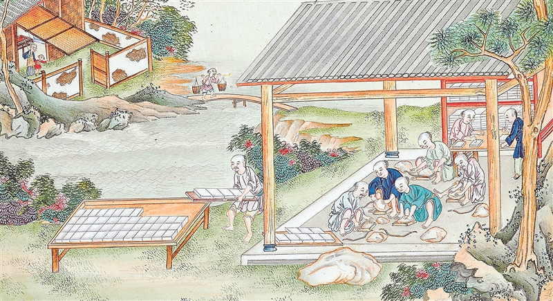 “做什么”这个问题解决后,我们开始思考“怎么做”。古代没有照相机,古人就把看到的劳动场景用绘画的形式记录下来。所以古代有不少绘画作品表现养蚕织丝、烧制瓷器等方面的内容,比如,《新诗造纸书画谱》描绘怎么造纸,《瓷器制运图》描绘怎么烧制瓷器。于是,编辑决定用中国古代名画为插图来讲述古代科技,将该系列取名为“中国名画里的天工开物”。