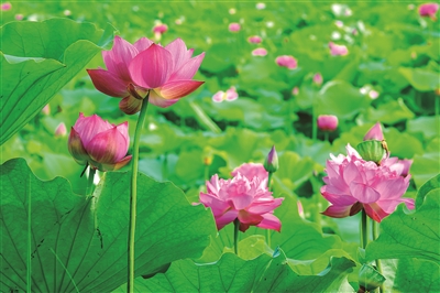 荷花又名莲花、芙蓉、菡萏(dàn)等,是我国十大名花之一,历史悠久,栽培广泛。我国最早的一部诗歌总集《诗经》中就有关于荷花的记载:“彼泽之陂,有蒲与荷。”荷花的花朵大,色彩丰富多样,有红、粉红、白、黄、绿等颜色。亭亭玉立的荷花,含苞待放时似娇羞少女、欲言又止,绽放时似世家贵女、落落大方。荷叶郁郁葱葱,似折扇,似玉盘,似舞裙,微风轻拂,其上晶莹剔透的水珠,摇曳滚动,增添了无限情趣。