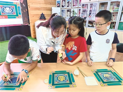 听完展览讲解,小朋友们跃跃欲试。木雕彩绘、衍纸画、模型拼插、叶子画等10余个互动体验项目,让孩子们大展身手,把天坛的鸟语花香画下来、将古建筑上的吉祥纹饰绘出来……