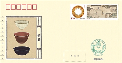 | 图①: 元·青花瓷。(作者供图) 图②: 明·宣德瓷器。(北京故宫博物院馆藏) 图③④: “瓷器”纪念封及内插页。(中国集邮有限公司供图) 图⑤: “瓷”篆刻章。(马国馨院士 刻) |