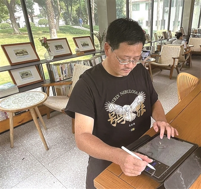 | 科学插画师曾刚在德芭与彩虹书店里绘制鸟类博物画(左图)。他用自己的画“乌林鸮”(右图)制作了文化衫。这家书店以自然、科普、博物图书和文创为特色,是武汉地区唯一一家以此为主题的书店。 程尚璇 摄 |