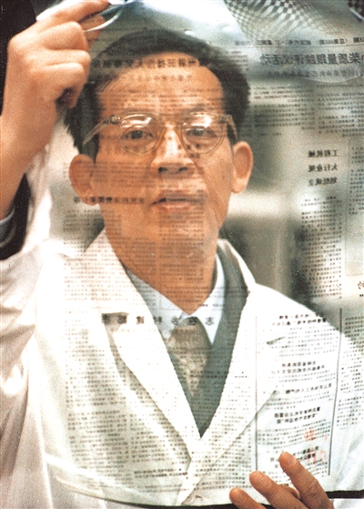 | 图为王选查看用激光照排系统输出的报纸胶片(1991年摄)。 |