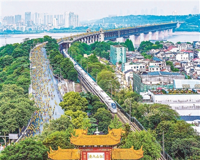 | 2018年4月15日,从武汉长江大桥穿行而过的高铁与马拉松比赛选手同框,构成了一幅科技时代与幸福生活的美好画卷。梅涛 摄 |