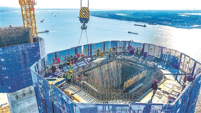 | 2024年1月23日,武汉双柳长江大桥北岸主塔施工现场。此塔在百米以下基岩层,植入集群桩基,解决了松软泥质粉砂地层区“在豆腐上插筷子”的难题。柯皓 摄 |