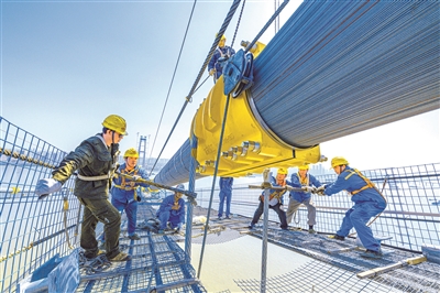 | 2018年10月28日,武汉杨泗港长江大桥施工现场,工人们在距江面200多米的猫道上安装悬索拉杆,将大桥稳稳地“锁定”在大江之上。黄蕾 摄 |