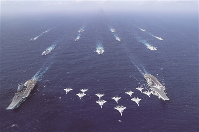 10月下旬,海军辽宁舰编队开展远海实战化训练。训练期间,编队转战黄海、东海、南海等多个海域,开展实战背景下多个科目综合演练。图为辽宁舰、山东舰编队首次开展双航母编队演练,锤炼提升航母编队体系作战能力。 新华社发 陈梦曦 摄
