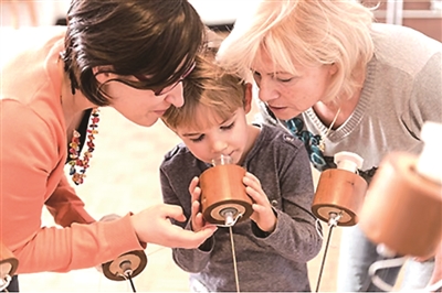 又如,声音展项能让游客通过触摸岩石、木材和大钟等不同材质的物体,感受声音振动的差别。游客甚至可以坐进青铜巨音碗中,让另一名游客用一个裹上皮革的木棒在碗外面慢慢地、有规律地摩擦,声音响起后,里面的游客在听到摩擦声的同时,也能感受到自己身体的震颤。此类互动帮助游客更好地理解声波是如何以波动形式传播的,并通过物体的振动产生感知。