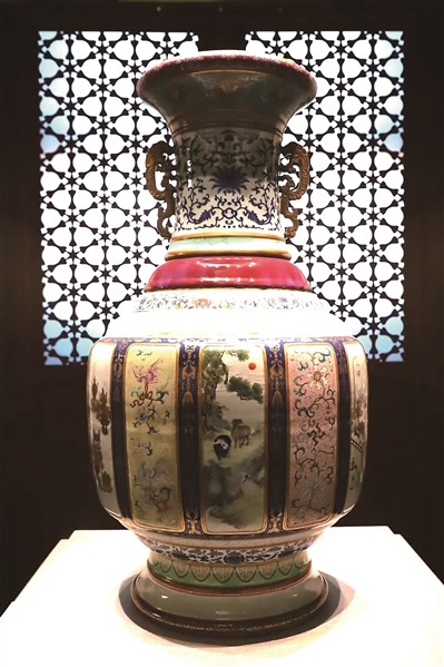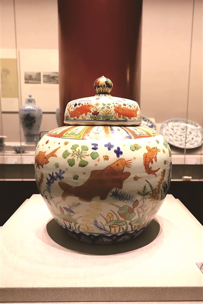 | 左图为清乾隆“各种釉彩大瓶”,高86.4厘米,口径27.4厘米,足径33厘米。 右图为明嘉靖“五彩鱼藻纹盖罐”。 (均为故宫博物院陶瓷馆藏品) 吕钟 摄 |
