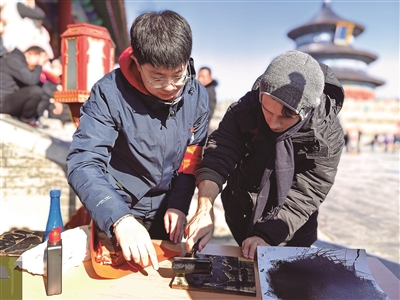 | 图为外国游客参与天坛“福字拓印”传统文化科普体验。 (作者供图) |