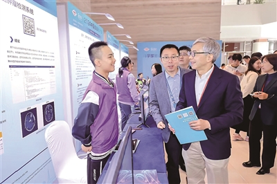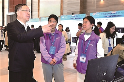 | 中国工程院院士、中国自动化学会理事长郑南宁(右一)与参展学生交流。 |