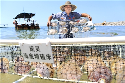 | 工作人员在核电基地附近海边,演示白蝶贝试养殖场景。在这片方圆约7000公顷的工业用海,累计养殖5万多只白蝶贝,通过它们吞噬海藻净化水质。 |