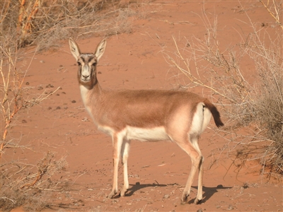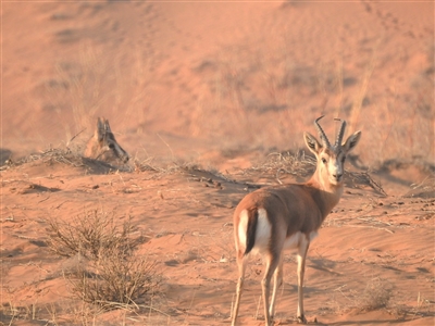 鹅喉羚属典型的荒漠、半荒漠区域生存的野生动物,体形似黄羊,因雄羚在发情期喉部肥大,状如鹅喉,故得名“鹅喉羚”。