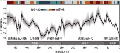 | 图为4.85亿年间全球平均地表温度变化与重大生物事件。(作者供图) |