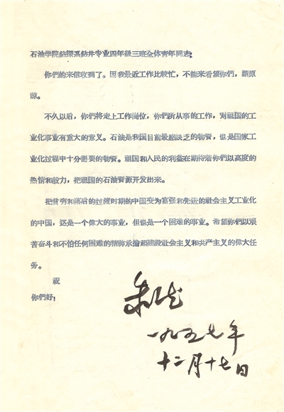 在朱德副主席的勉励下,同学们奔赴石油开发一线。这封回信也被收藏在了中国石油大学校史馆里。