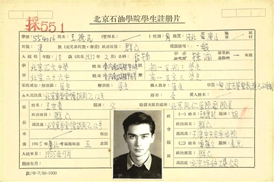| 右图为中国工程院院士王德民1955年在北京石油学院的学籍卡。王德民院士被网友评为“最帅院士”。 (中国石油大学校史馆供图) |
