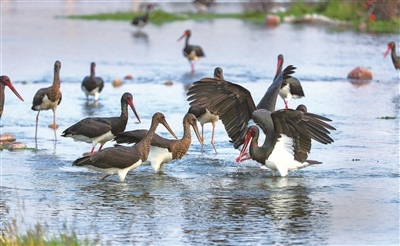 黑鹳(ɡuàn),体表颜色乌黑,民间俗称老油鹳、黑老鹳、锅鹳,是国家一级保护动物。因数量稀少,黑鹳素有“鸟中大熊猫”之称。图为11月19日,河北石家庄,黑鹳在井陉(xínɡ)县境内绵蔓河栖息越冬。视觉中国供图