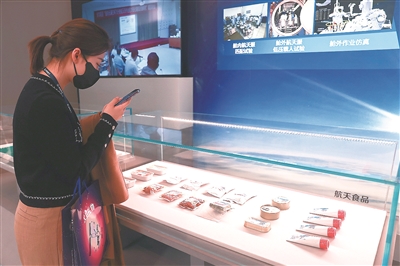 | 图为观众在中国国家博物馆用手机拍摄航天食品。 视觉中国供图 |
