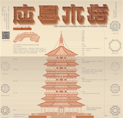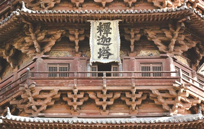 应县木塔,即佛宫寺释迦塔,塔高67.31米,底部直径30余米,总重量为7400多吨,所用木料多达上万立方米。整个建筑由塔基、塔身、塔刹三部分组成,塔基分为上下两层,下层为正方形,上层为八角形。塔身呈八角形,外观五层六檐,实为明五暗四的九层塔。木塔的内部构造独特,通体由内8根外24根木柱组成双层套筒式结构,梁柱交叠,斗拱相连,刚柔相济,建构科学。全塔上下没有用一颗铁钉,全系木质构件互相卯榫咬合而成。木塔设计精密、建造宏伟、内涵丰富,融建筑、文化、宗教和艺术于一身,被赞为中国古代“最迷人的木构建筑之一”。