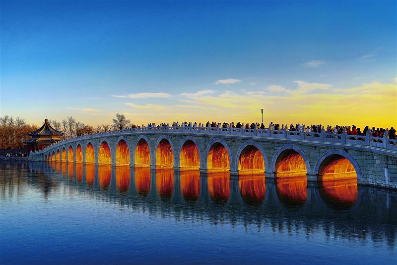 12月9日,众多市民来到颐和园南湖岛拍摄十七孔桥“金光穿洞”奇景。冬日的颐和园,夕阳穿过十七孔桥的桥洞,如金丝般洒入水面,照亮古老的桥洞与清澈的湖水,引来游人纷纷拍照。据悉,颐和园“金光穿洞”的最佳观赏时间是冬至节气前后的16时左右,这一景象每天大约持续20分钟。视觉中国供图